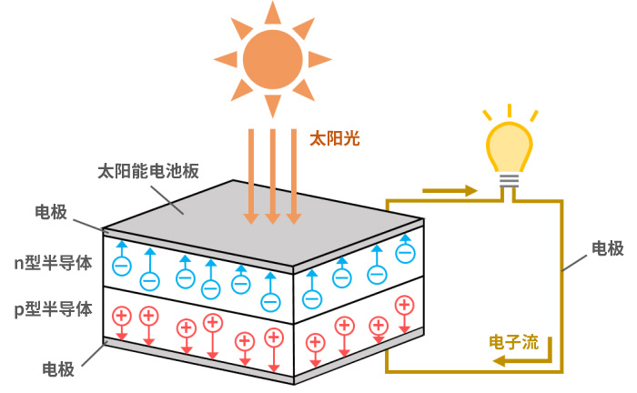 太阳能电池由两种半导体(即:n型半导体和p型半导体)粘合而成,两种半导体之间使用通电导线连接。当太阳光照射到太阳能电池板时,n型半导体聚集负电荷(电子),p型半导体聚集正电荷,而当负电荷的电子流经导线时,电力便产生了。LED(发光二极管)就是利用这种逆向发电原理。