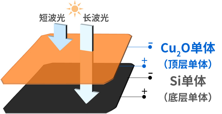 “硅材料使用长波长的太阳光(600~1100nm)发电,Cu?O材料使用短波长的太阳光(300~600nm)发电,并且因为它是透明的,长波长的太阳光也可以透过。换言之,这两种材料发电所需的太阳光波长范围不相重叠,因此,在硅材料上面叠加Cu?O材料,就可以创造出一种理想的电池,充分利用从短波到长波的太阳光的能量。